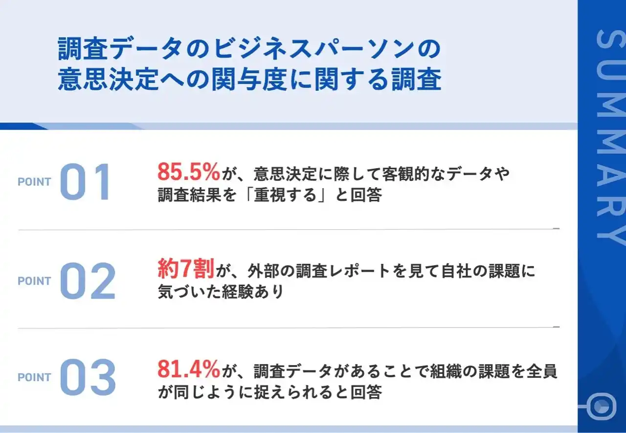 まず、72.7%が自身の仮説や直感を裏付けるような調査データを探した経験があることが分かりました。また、約7割(69.4%)が外部の調査レポートを見て自社の課題に気づいた経験があり、その際「共感した」(21.4%)や「新たな発見があった」(20.5%)といった感情を持つことが明らかになりました。さらに、社内の意思決定者と共通認識を持つために効果的な情報として、「導入事例やケーススタディ」(45.8%)や「業界の調査レポートや統計データ」(39.9%)が上位に挙げられています。加えて、81.4%が調査データがあることで組織の課題を全員が同じように捉えられるようになると回答し、85.5%が意思決定に際して客観的なデータや調査結果を重視していることが判明しました。 |