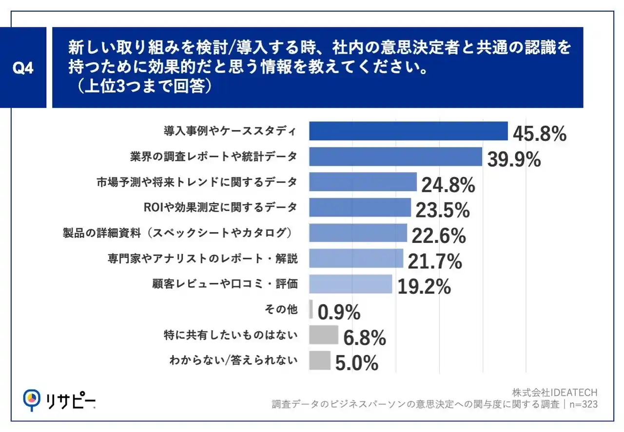 「Q4.新しい取り組みを検討/導入する時、社内の意思決定者と共通の認識を持つために効果的だと思う情報を教えてください。(上位3つまで回答)」(n=323)と質問したところ、「導入事例やケーススタディ」が45.8%、「業界の調査レポートや統計データ」が39.9%、「市場予測や将来トレンドに関するデータ」が24.8%という回答となりました。 |
