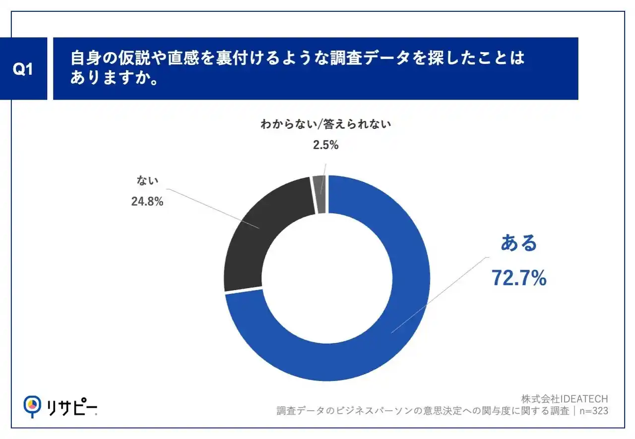 「Q1.自身の仮説や直感を裏付けるような調査データを探したことはありますか。」(n=323)と質問したところ、「ある」が72.7%、「ない」が24.8%という回答となりました。 |