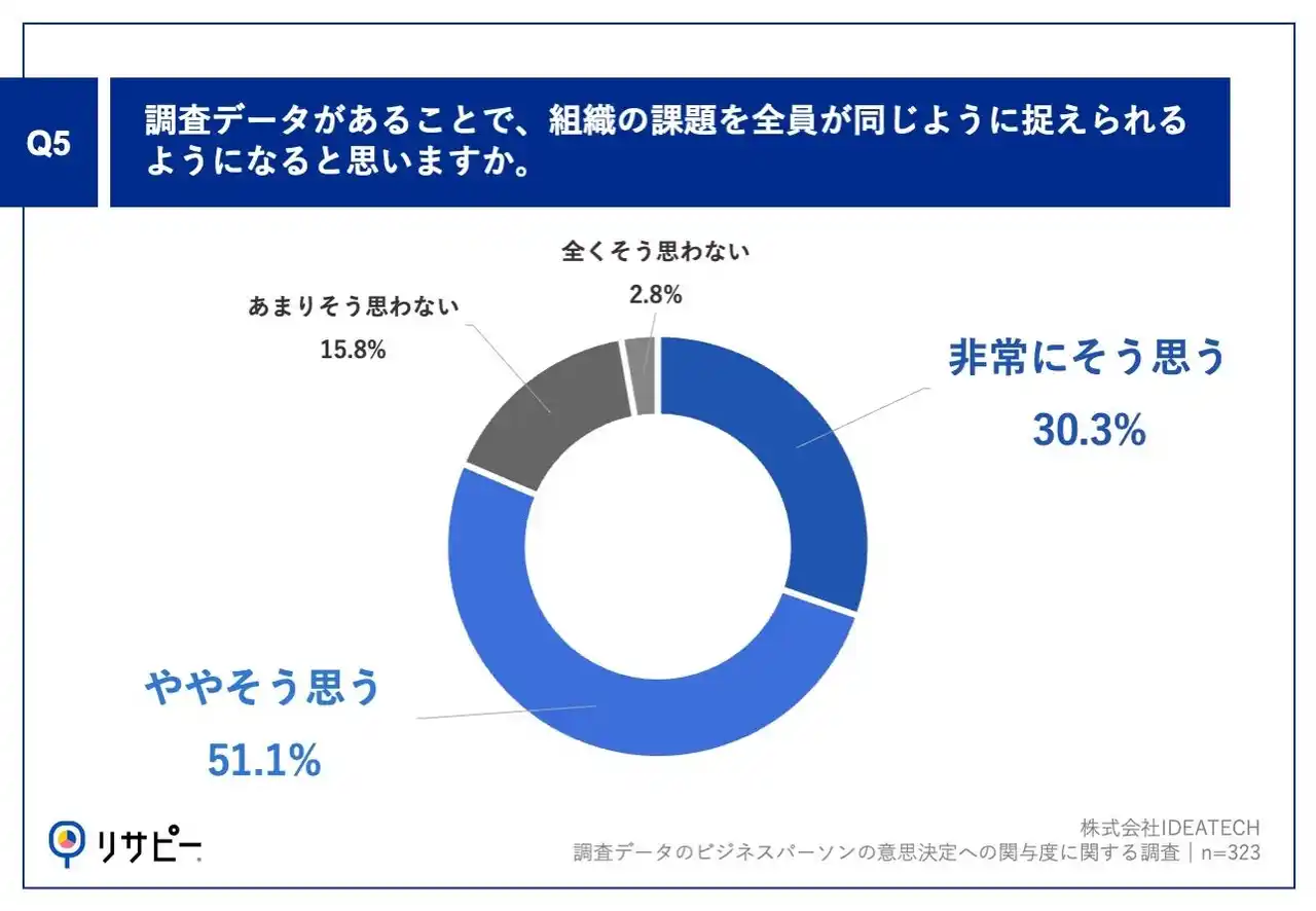 「Q5.調査データがあることで、組織の課題を全員が同じように捉えられるようになると思いますか。」(n=323)と質問したところ、「非常にそう思う」が30.3%、「ややそう思う」が51.1%という回答となりました。 |