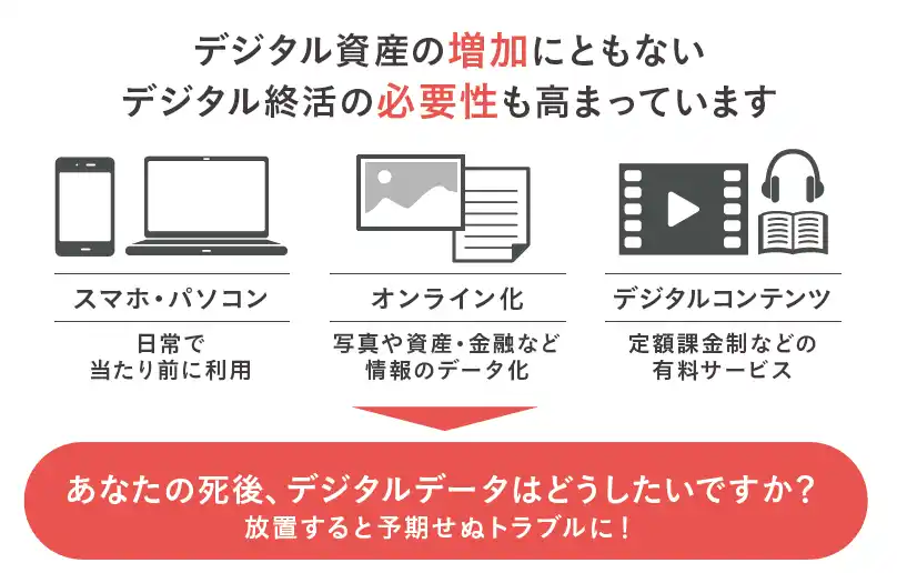 誰もが「デジタル遺品」のお困りごとを抱える当事者になり得るため、世代や年齢に関係なくデジタル整理をする必要性が高まっています。 |