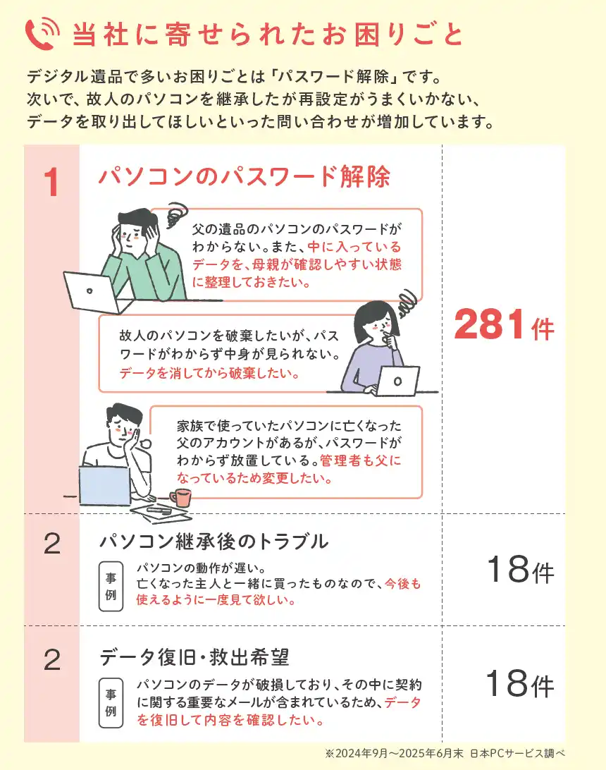 デジタル機器の設定・トラブル解決を行う日本PCサービス株式会社(本社:大阪府吹田市、代表取締役社長:家喜 信行、証券コード:6025、以下「当社」)は「デジタル遺品」に関するパソコンやスマホのトラブル相談の増加を受け、全ての世代で行うべきデジタル機器やデータの管理・整理術をまとめた 『デジタル整理ガイド 2025』を2025年8月14日(木)より無料配布します。ガイドはPCホスピタル公式サイトでダウンロード可能な他、一部店頭でも順次配布を予定しています。 |