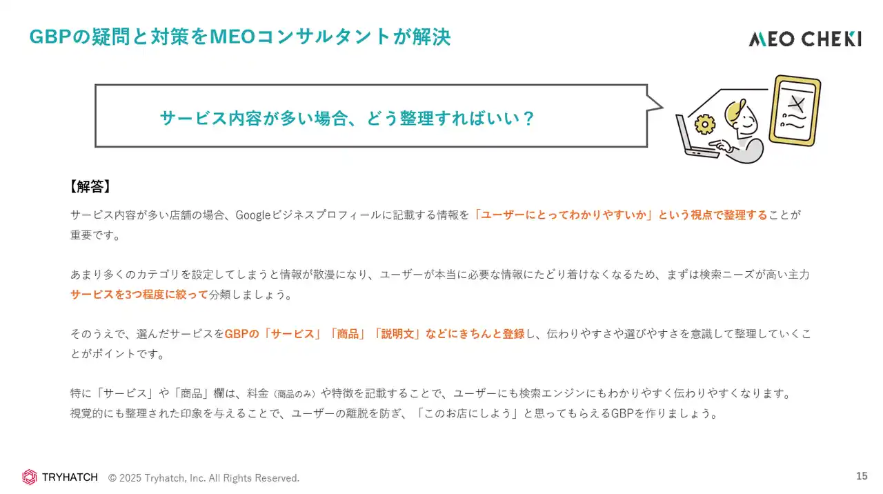 カテゴリや項目を必要以上に増やすと情報が分散し、かえってユーザーが欲しい情報にたどり着けなくなる可能性があります。そのため、まずは検索ニーズが高い主力サービスを3つ程度に絞り、「サービス」や「商品」「説明文」欄にわかりやすく登録・分類していくことが効果的です。 |