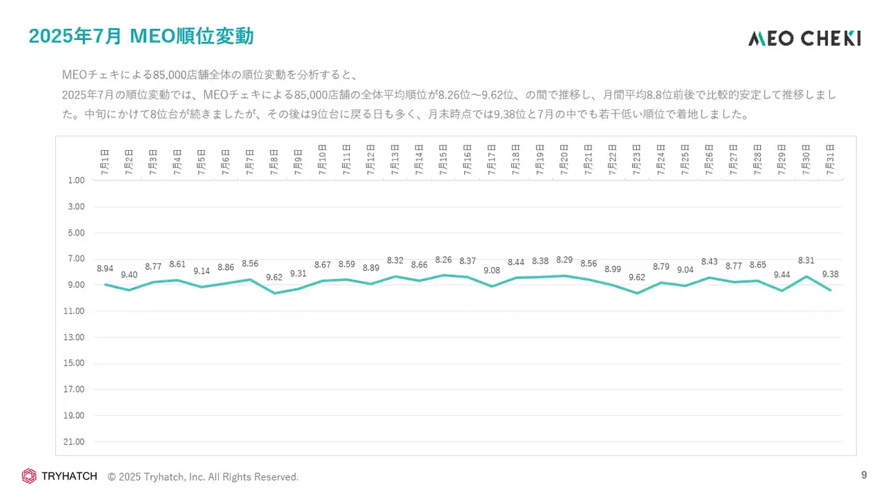 2025年7月の平均順位は安定しており、8.26位~9.62位の範囲で推移しました。月間平均8.8位で比較的安定して推移しました。中旬にかけて8位台が続きましたが、その後は9位台に戻る日も多く、月末時点では9.38位と7月の中でも若干低い順位で着地しました。 |
