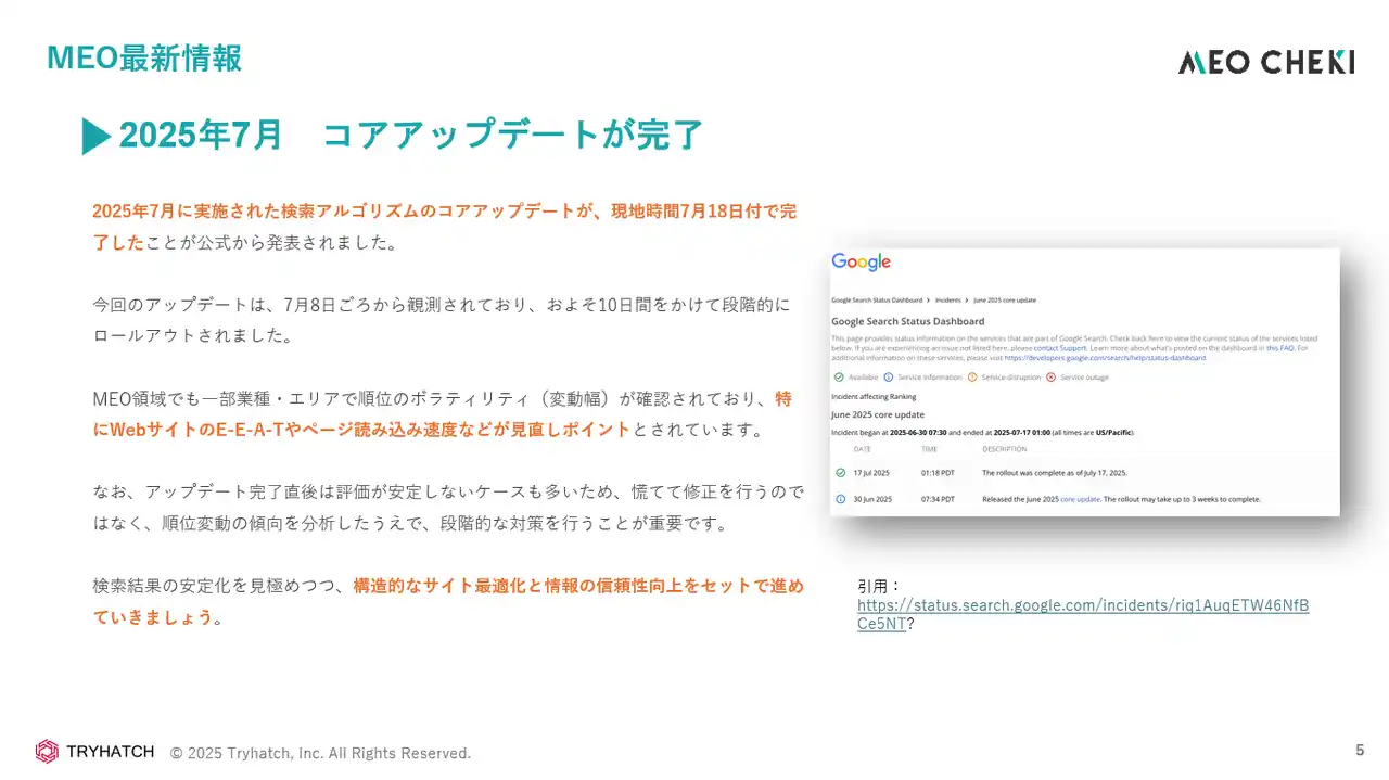 2025年7月、Google検索におけるコアアルゴリズムアップデートが完了し、MEO領域でも一部業種・エリアにおいて順位の大幅な変動が確認されました。特にWebサイトのE-E-A-Tや表示速度といった評価軸の見直しが進んでおり、検索結果の安定化を見極めながら、段階的な構造最適化が求められます。 |
