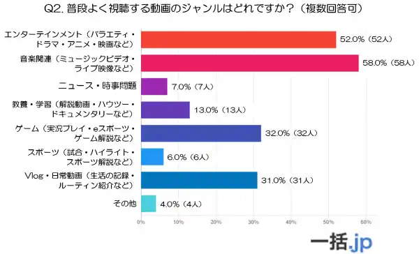 最も多かったのは「音楽関連(ミュージックビデオ・ライブ映像など)」で、58.0%(58人)が選択しており、日常的に音楽を楽しむ習慣が根強いことがうかがえます。