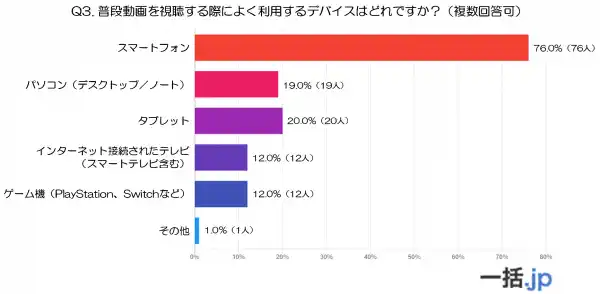 また、「インターネット接続されたテレビ(スマートテレビ含む)」と「ゲーム機(PlayStation、Switchなど)」はいずれも12.0%(12人)で、リビングでの視聴やゲーム環境を活用した視聴も一定数存在しています。
