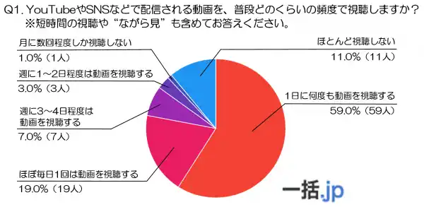 こうした背景を踏まえ、厳選された動画・映像制作会社を紹介するBtoBマッチングサイト『一括.jp(https://emeao.jp/ikkatsu-column/company-introduction-video-examples/ )』は、10代の男女100名を対象にアンケート調査を実施しました。調査は「動画視聴頻度」「好まれるジャンル」「利用デバイス」という3つの視点から、10代のリアルな視聴習慣と傾向を明らかにしています。