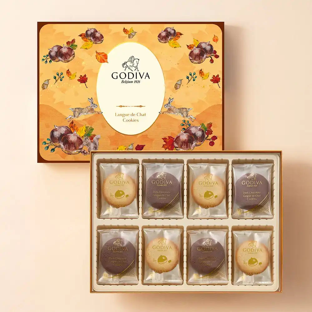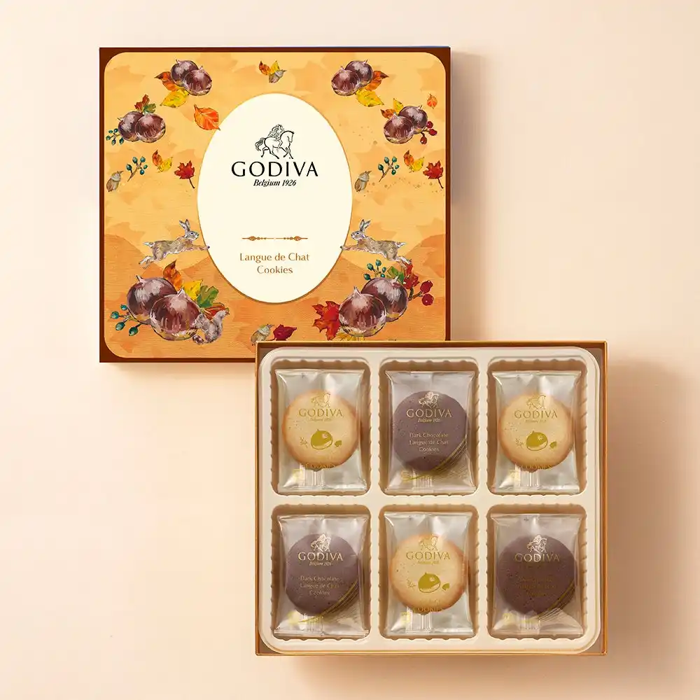 モンブランラングドシャクッキー アソートメント 栗のイラストが秋らしい華やかなパッケージに詰め合わせた、2種類のラングドシャクッキーです。限定フレーバー「GODIVA モンブラン ラングドシャクッキー」は、風味豊かなマロンパウダーを練りこんだホワイトチョコレートを、芳醇な香りのマロンペーストを丁寧に練りこんだラングドシャでサンドしたクッキーです。定番の「ダークチョコレート ラングドシャクッキー」と詰め合わせました。サクッとした口あたりと、風味豊かなチョコレートのハーモニーをお楽しみください。 |