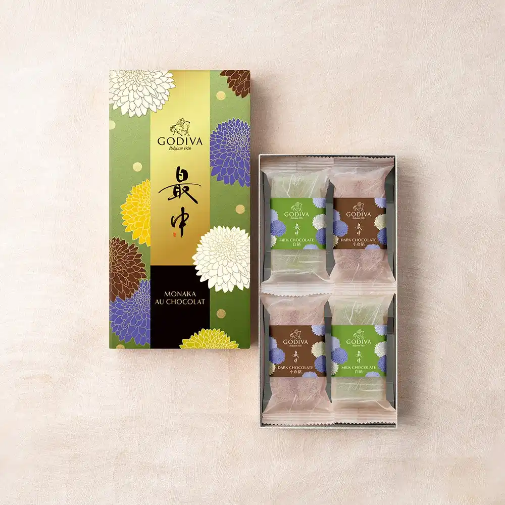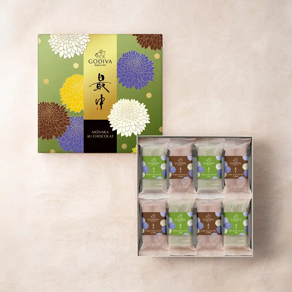 最中 オ ショコラ ゴディバが手がけた和菓子「最中 オ ショコラ」は、チョコレート餡と最中皮を別々に個包装しており、食べる直前にサンドしていただくことでサクサクの食感を感じていただけます。「ミルクチョコレート白餡」と「ダークチョコレート小倉餡」による2種類のアソートメントは、海外のデザイナーから見た日本の美しさの表現と日本の書道家によるオリジナルの「最中」の書で和を意識した、限定のパッケージデザインで仕上げました。 |