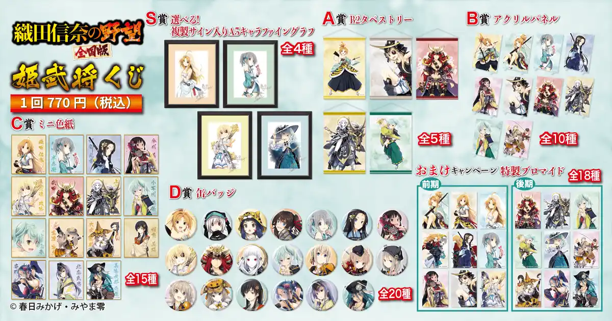 春日みかげ先生の新作『燃えよ剣と魔法 異世界で美少女沖田総司を召喚したら、歴史知識で懐かれた』が2025年7月にファンタジア文庫にて刊行されたことを記念して、前作『織田信奈の野望 全国版』のオンラインくじが発売されることになりました! くじに登場するキャラを「姫武将」に絞った本作らしい内容となっています。みやま零先生の美麗なイラストが楽しめる賞品が盛りだくさんなので、ファンの方は必携! また、期間中に“リポストキャンペーン”として、くじ引き堂のX公式アカウントをフォロー&リポストすると、抽選で3名様に「D賞 缶バッジ全20種セット」をプレゼント。この機会をお見逃しなく!! |