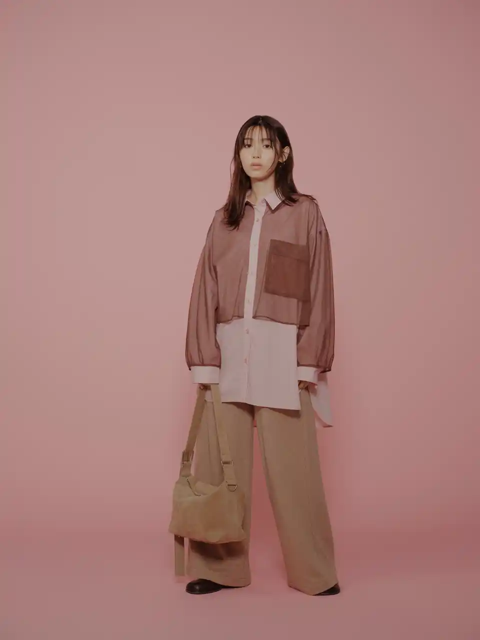 異素材ミックスが目を引くシャツは、一枚で今季らしさが高まる主役アイテム。ピンク×ブラウンのカラーリングが、ほんのり甘く上品な印象に導いてくれます。 |