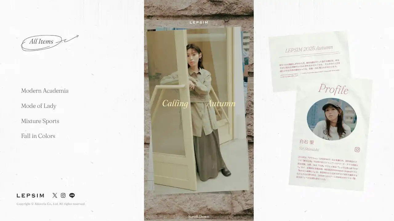 株式会社アダストリア(本部:東京都渋谷区渋谷2-21-1、代表取締役社長:木村 治)が展開する「LEPSIM(レプシィム)」は、女優・白石聖さんが“Calling Autumn”をテーマにブランドの最旬ルックをまとう秋のブランドビジュアルをレプシィムの各店舗と公式WEBストア and ST (アンドエスティ)にて2025年8月14日(木)より公開いたします。 |