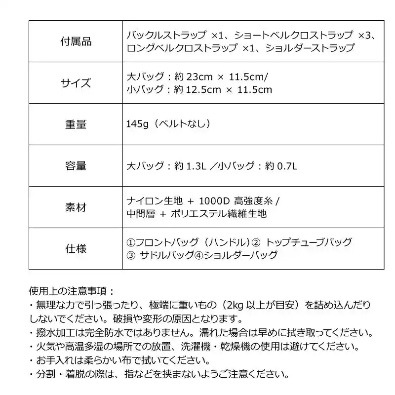 ・無理な力で引っ張ったり、極端に重いもの(2kg以上が目安)を詰め込んだりしないでください。破損や変形の原因となります。 ・撥水加工は完全防水ではありません。濡れた場合は早めに拭き取ってください。 ・火気や高温多湿の場所での放置、洗濯機・乾燥機の使用は避けてください。 ・お手入れは柔らかい布で拭いてください。 ・分割・着脱の際は、指などを挟まないようご注意ください。 |
