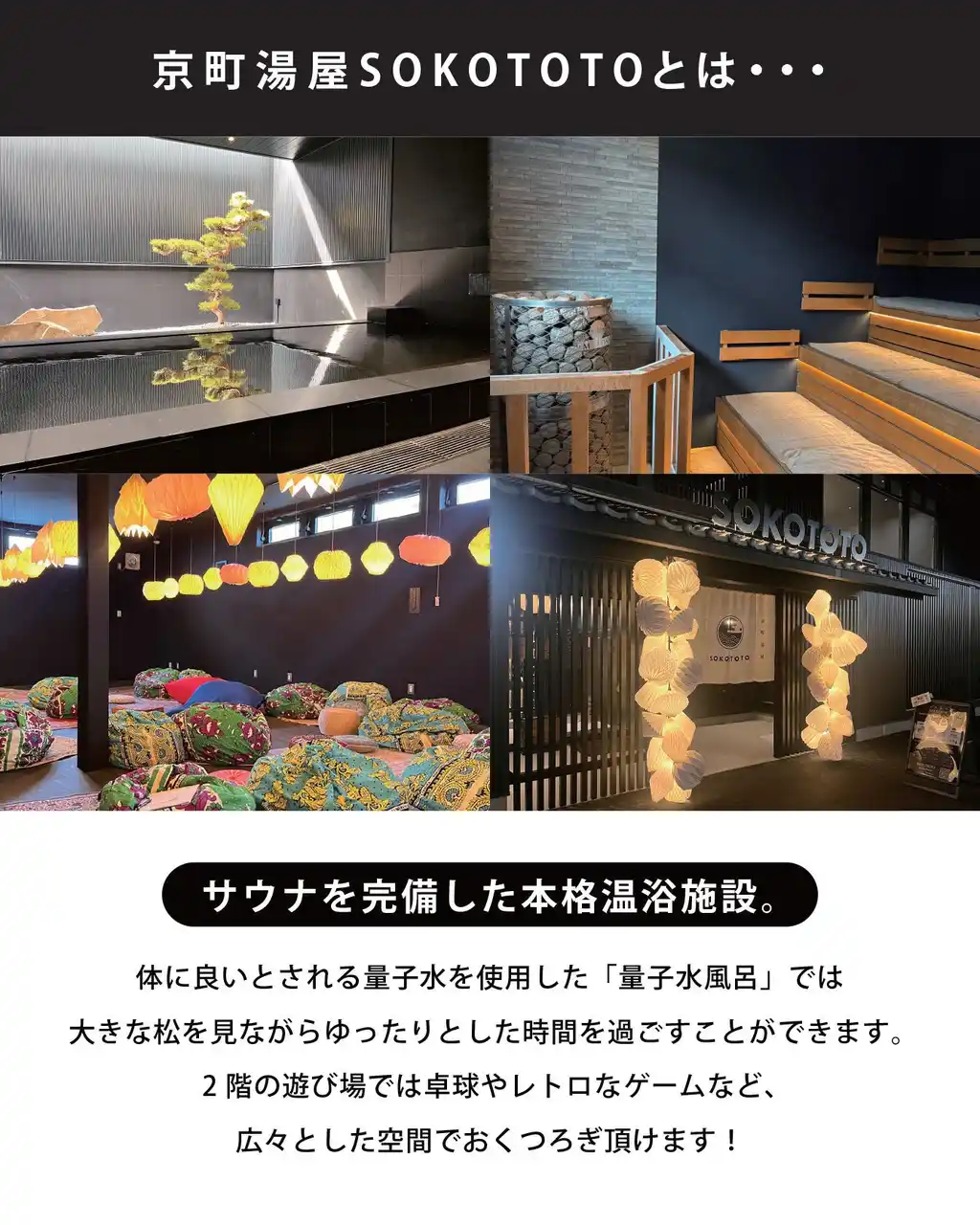 さらに嬉しいのは、お得なセットプラン。 2時間遊び放題に加えて、京町湯屋SOKOTOTOのお風呂券がついて1,500円! 汗をかいたあとは、量子水を使ったお風呂や本格サウナでリフレッシュ。大きな松を眺めながら、心も体もゆったりと癒される贅沢なひとときが待っています。 |