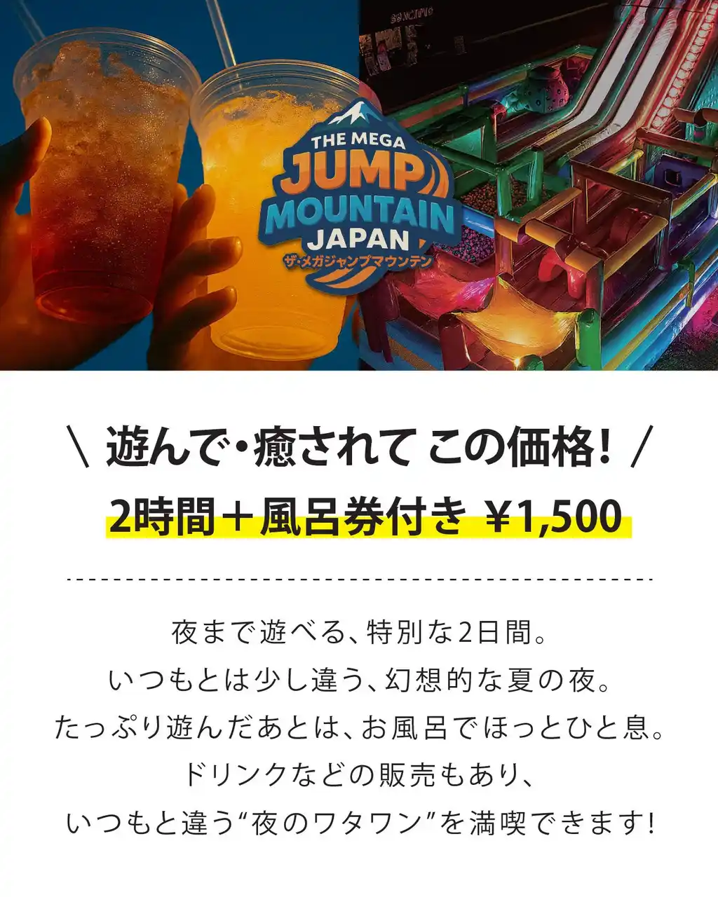 昼間とはひと味違う開放的な空間で、迫力のジャンプやスライダーを思い切り楽しめるほか、ドリンク販売など夜ならではの楽しみもご用意しています! |