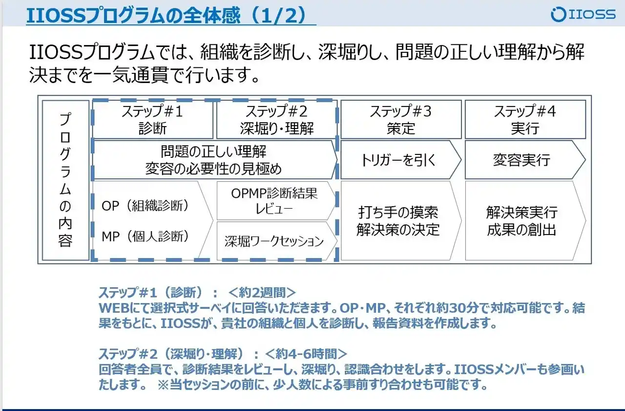 事業内容: 組織診断プログラム「IIOSS」の開発・提供/組織・経営コンサルティング |