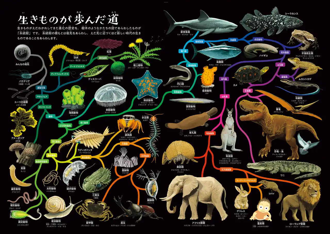 『ゆびでたどる進化のえほん』のなかの、すべての生きものの分類がわかる「生きものが歩んだ道」ページを拡大したポスターです。 |