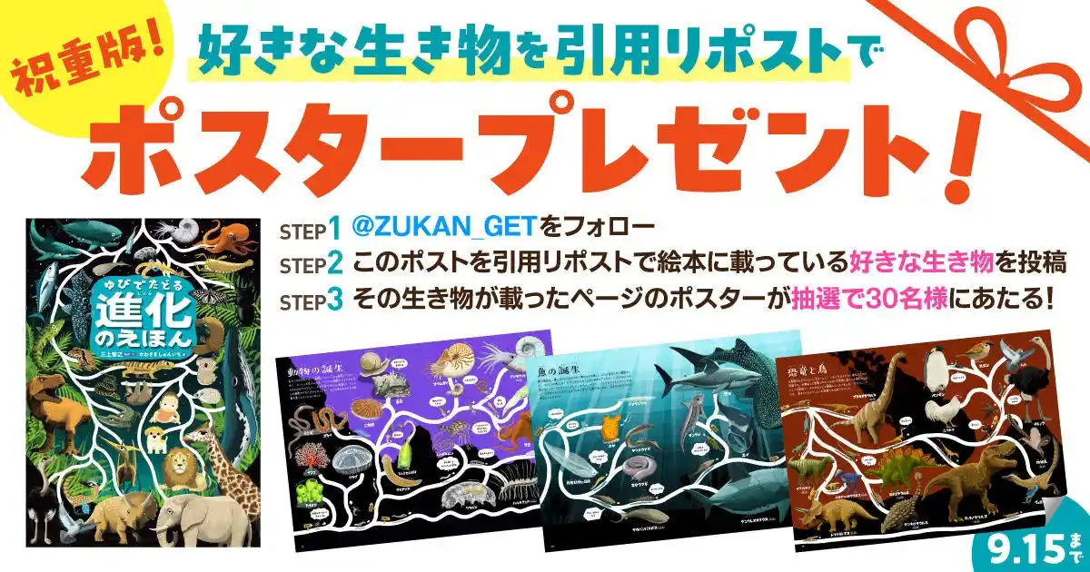 Xでキャンペーン対象投稿に「絵本に載っている好きな生き物」を書いて引用リポストすると、その生物が掲載されているページのポスターが抽選で30名様にあたります。 |