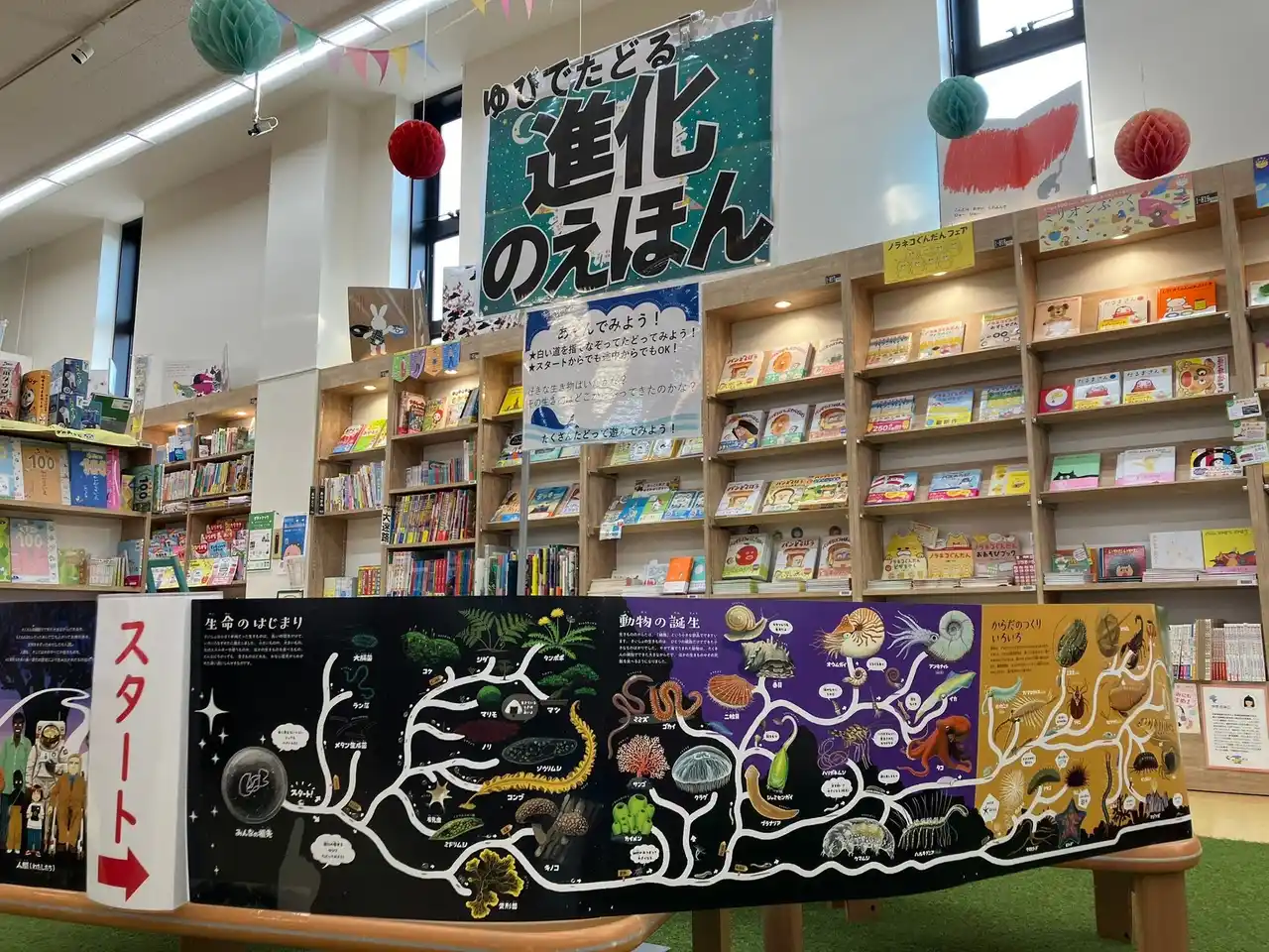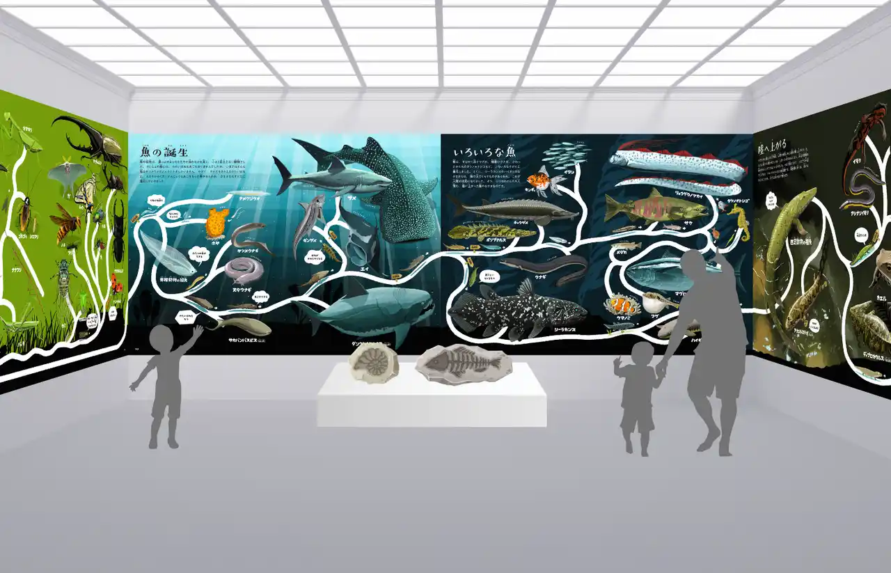 絵本のページを横につなげて張り合わせることで、進化の道がページをまたいでつながり、歩きながら眺めて楽しめるパネル展示になります。パネルにあわせて標本や化石などを展示いただくことも可能です。 |