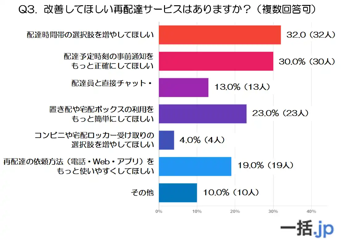 最も多かったのは「配達時間帯の選択肢を増やしてほしい」で、全体の32.0%(32人)が回答しており、利用者の多くが時間帯指定の柔軟性向上を望んでいることが分かります。 |