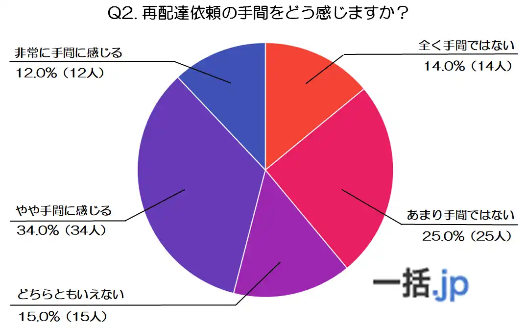最も多かったのは「やや手間に感じる」で、全体の34.0%(34人)を占め、再配達依頼が多少煩わしいと感じる人が一定数存在することが分かります。 |