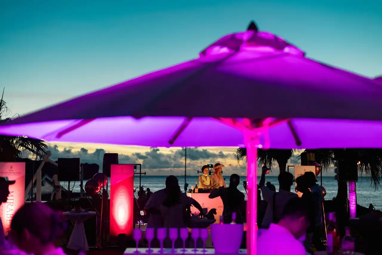 ピンクと白をテーマにした本イベントは、美しい珊瑚礁とエメラルドブルーに輝く万座ビーチで開催され、テーマカラーを身につけた参加者の皆様は爽やかでエレガントなメゾン・ミラボーのロゼワインを片手に、音楽や夕陽に酔いしれました。ライブパフォーマンスには、沖縄県内で人気のDJ KIORAさんや、国内外のファッションパーティーなどでも活躍するDJ UNA+MATCHA さん等も登場し会場をさらに盛り上げました。そして、2日間のイベントフィナーレには、美しい夜空にピンクを基調とした華麗な花火が上がり、さらに皆様の心に刻まれる夏のイベントとして幕をとじました。 |