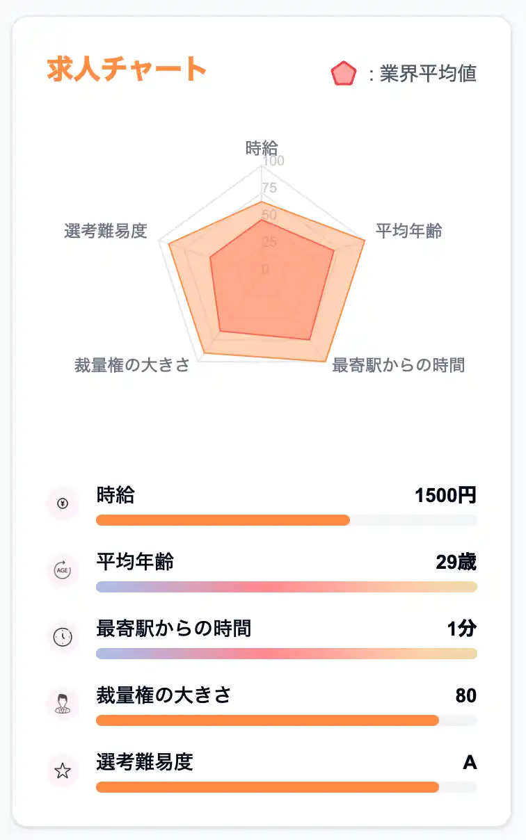 2. “目的と経験軸”で探せる検索・特徴タグ 一般的な勤務地・職種に加え、「得られる経験」「挑戦領域」「働き方の特徴」などのタグで絞り込み可能。学生は“どんな成長が得られるか”から選べます。UI上の「求人チャート」で、学習・裁量・スピード感など職場環境を定量×視覚で把握でき、企業選びの解像度が上がります。 |