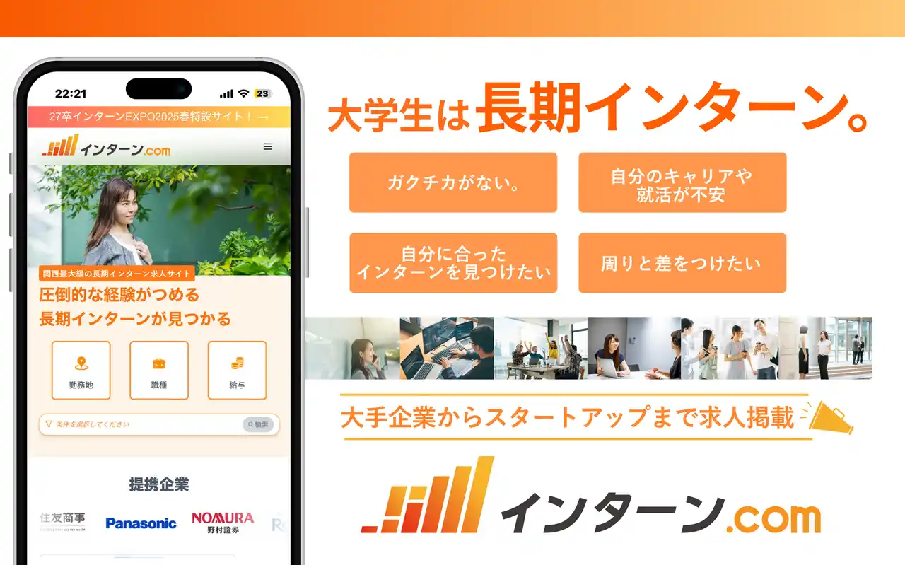 「インターン.com」は、関西発・インターン特化のマッチングプラットフォームです。β版では、全国で50件超の厳選インターン求人を掲載(順次拡大)。学生は“面接前に実務を知る”ことで納得感ある意思決定を、企業は“現場で見極める”ことでミスマッチの少ない採用を実現します。 ※搾取的・実務と乖離した内容のいわゆる“インターンと呼べない求人”は掲載不可。質の高い求人のみを届ける掲載ポリシーで運営します。 |