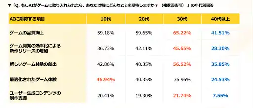 | 年代別で見ると、重視される項目に差異が見られる。10代・20代では「ゲームの品質向上」が約60%と非常に高く、若年層が安定したゲーム体験を重視する傾向がある。特に10代は「最適化されたゲーム体験」(46.94%)への期待も高い。一方、30代は「ゲームの品質向上」(65.22%)に加え、「新しいゲーム体験の創出」(56.52%)への期待が全年代で最も高く、AIへの期待が特に高い傾向がある。40代以上では「ゲームの品質向上」(41.51%)が引き続き上位だが、全体的に期待の割合は他年代に比べて落ち着いた傾向にある。 | |||