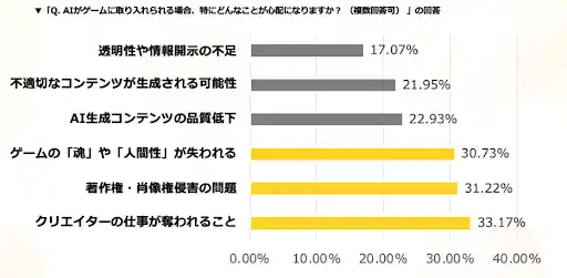 | AIのゲーム導入に対する懸念事項としては、「クリエイターの仕事が奪われること」「著作権・肖像権侵害」「ゲームの『魂』や『人間性』の喪失」が上位を占め、倫理的・創作的な側面にユーザーの強い不安がある | |||