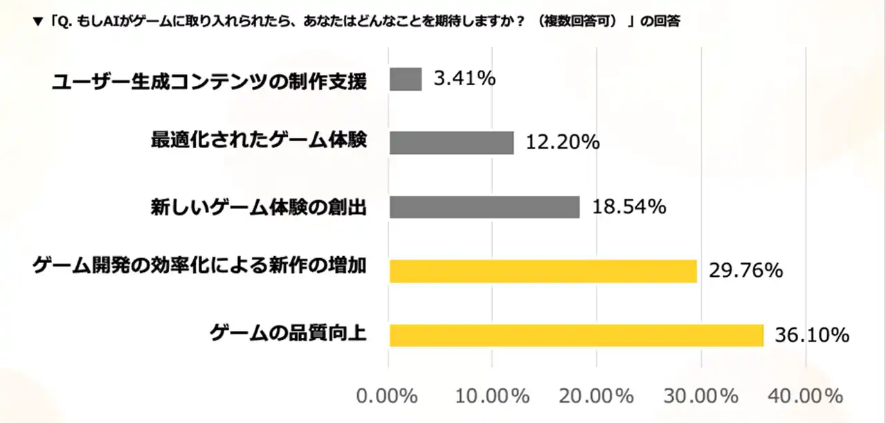 | 生成AIの活用について「ゲームの品質向上」を最も強く期待しており、同時に「新しいゲーム体験の創出」や「ゲーム開発の効率化による新作の増加」といった多面的な価値を求めている | |||