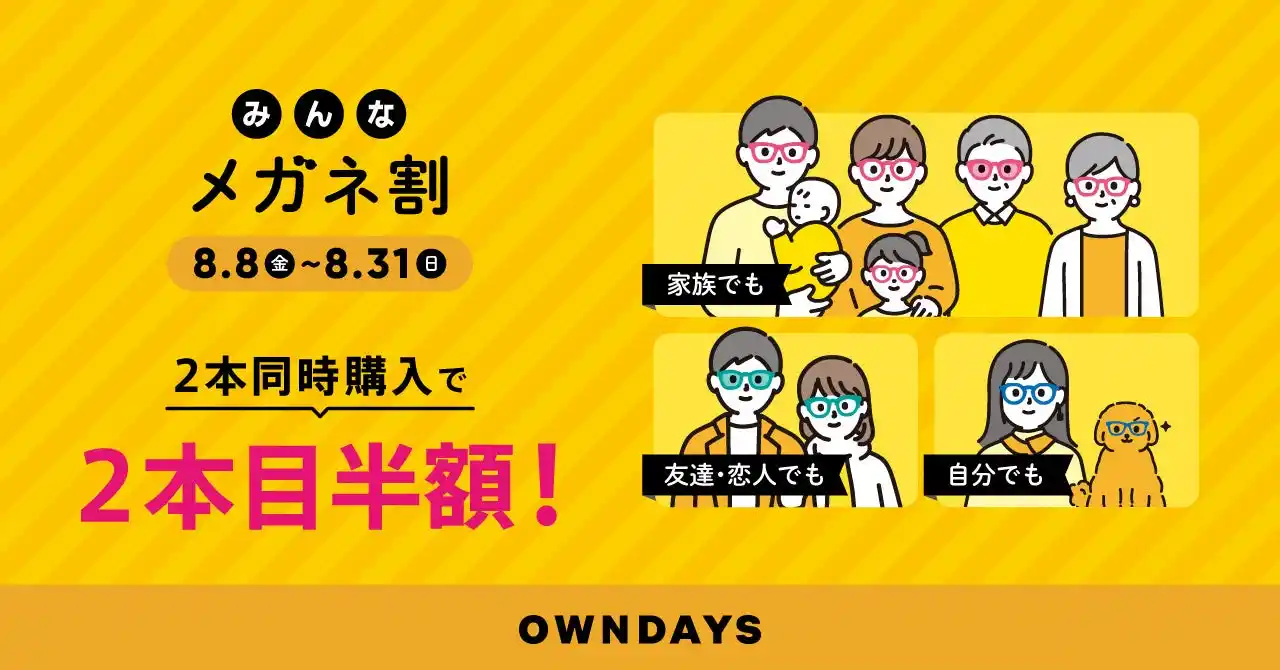 現在、OWNDAYSではお得な「みんなメガネ割」キャンペーンを開催中です。おひとりでの複数本購入はもちろん、ご家族やご友人、恋人同士で一緒にご購入いただくと2本目以降が半額となります。本キャンペーンは、全国の店舗およびオンラインストアにて8月31日(日)まで実施しております。