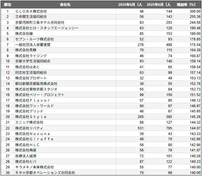 株式会社SalesNow(本社:東京都渋谷区、代表取締役:村岡功規、以下「当社」)は、国内540万社の企業情報を完全網羅した日本最大級のデータベース「SalesNow DB」より、人口の多い上位30都市を対象とした「従業員数増加率ランキング」を発表しました。本リリースでは、各都市別のデータをもとに、今回は「京都市に本社を置く企業」を対象に、従業員数の増加傾向にフォーカスします。