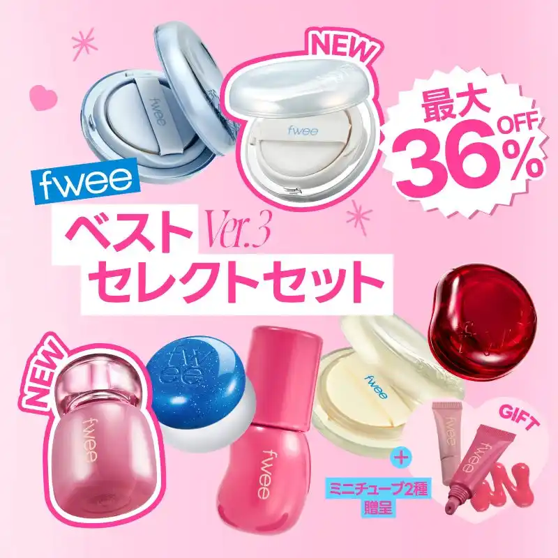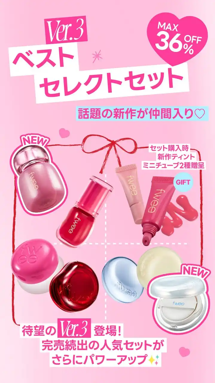 「ベストセレクトセット」はQoo10メガ級セール限定で販売開始される特別なメイクセットです。ベース、リップ&チーク、リップから好きに選べる内容に加え、今回は話題の新作ティントとクッションガラスオリジナルが新たにラインナップ。より魅力的で“思わず手に取りたくなる”セットとして販売開始されます。 |