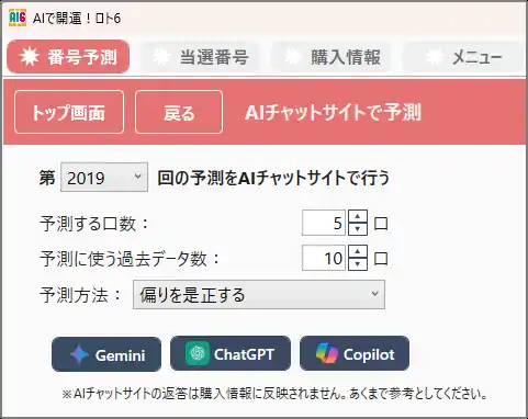 この機能では、「ChatGPT」や「Gemini」などの「AIチャット」に次回の当選番号を予測させるための「プロンプト」を作成します。 |