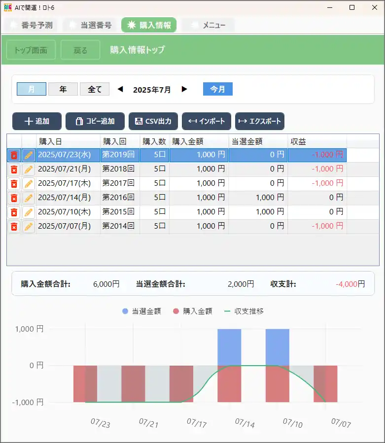 また、予測で算出された数字をそのまま「宝くじ公式サイト」に流し込み、ロト6の購入までを同じ操作画面内で行えたり、ロト6購入による収支をグラフで確認できたりなど、ロト6をとことん楽しんでいただくための機能を多数搭載しております。 |