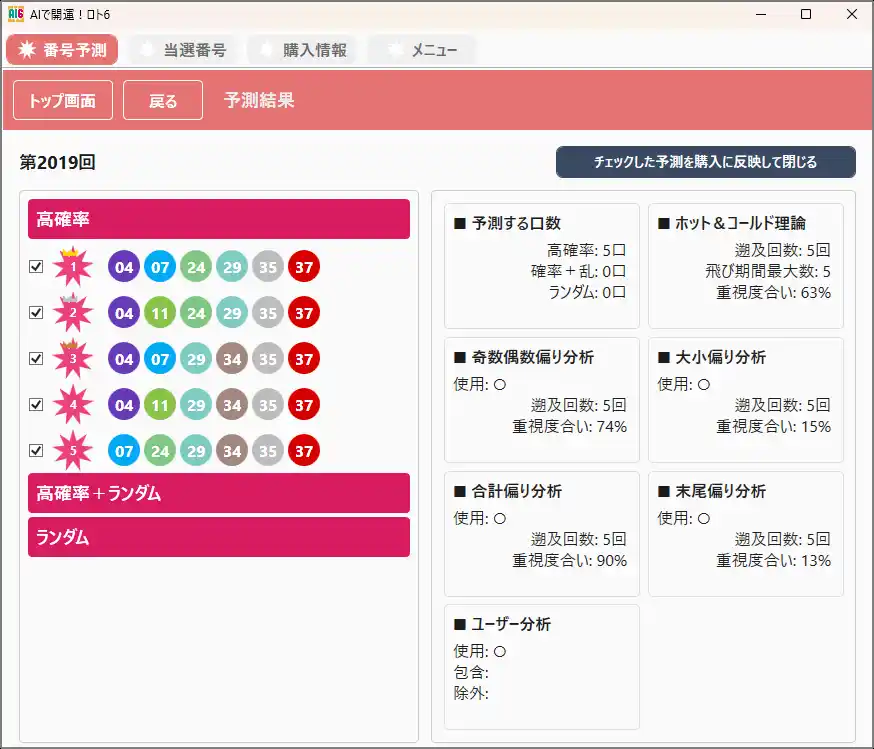 今回発売しましたシリーズ第3弾「AIで開運!ロト6」は、【AIのチカラでロト6の当選番号を予測する】という新たなコンセプトで開発しました。これまでは過去の当選番号を集計し、「5つの理論」を駆使して次回の当選番号を予測しておりましたが、この機能は残しつつ、AIに予測させる機能を追加した形です。 |