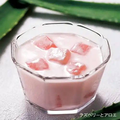 ラズベリーソースを加えたヨーグルトにアロエ葉肉を合わせた、甘酸っぱくさっぱりとした味わいのヨーグルト。こちらは詰合せ限定品。 |