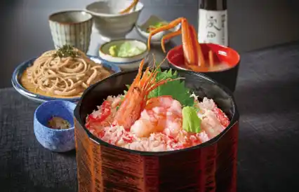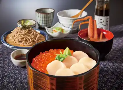 プチプチとした食感が特徴の「北海道産いくら」と、とろけるような甘みと旨みが凝縮された「北海道産ほたて」を惜しみなく盛り付けました。セットとしてご提供するかに汁は、北海道産の米味噌を使用し、オオズワイガニの旨みを存分に引き出しました。北海道産そば粉を使用したのど越しの良いお蕎麦とともに、ご堪能ください。 |