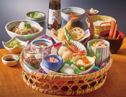 お刺身には、北海道産のいくら・ほたて・するめいかを盛り込み、オオズワイガニの旨みを北海道産米味噌で仕立てたかに汁、そして北海道産そば粉を使用したのど越しの良いお蕎麦を組み合わせています。デザートの白玉ぜんざいには北海道産小豆を使用し、随所に北海道産食材のこだわりをちりばめました。他にも、天ぷら・茶碗蒸し・小鉢・ご飯・漬物など、多彩な料理が織りなす豊かな味わいを、ぜひ心ゆくまでお楽しみください。 |