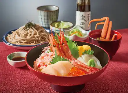 口の中でとろける甘みの「ほたて」、プチプチとした食感が楽しめる「いくら」、旨みが凝縮された「するめいか」など、北海の幸を贅沢に盛り込んだ丼です。セットのかに汁には、北海道産の米味噌を使用し、オオズワイガニの旨みを存分に引き出しました。かにの風味豊かな出汁がお楽しみいただけます。 |