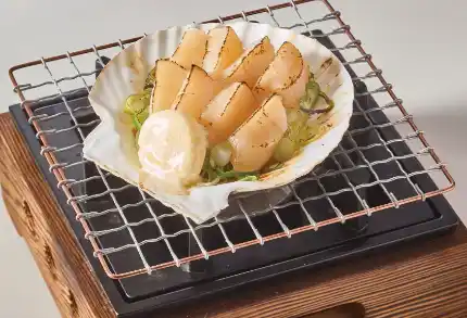 ほたての殻を器に見立て、網焼きでじっくりと焼き上げることで、出来立て熱々をお召し上がりいただけます。バターの香りが溶け出した特製の醤油タレを、香ばしく焦げ付かせることで、ほたて本来の甘みと旨みが一層引き立ちます。熱々のほたては、口の中でとろけるような食感と、香ばしい醤油の風味が広がり、食欲をそそる一品です。日本酒やビールなどのお酒とも相性が良く、お食事の一品としてはもちろん、おつまみとしてもお楽しみいただけます。 |