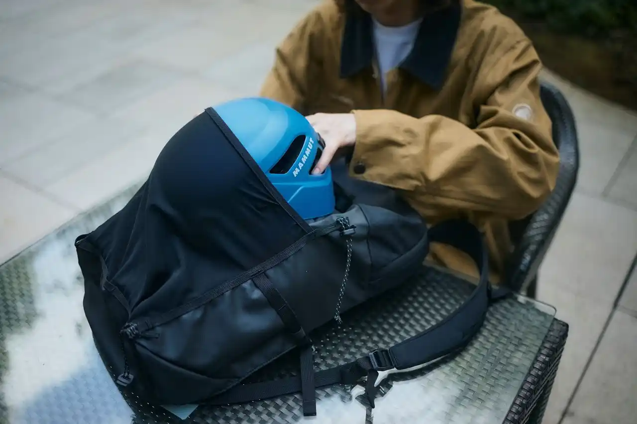 特徴的な機能としては、どのバックパックにもヘルメットホルダーになるポケットが付属しており、通勤時に自転車を使用することが多いヨーロッパのニーズに合わせています。 ヘルメットを使用しない場合には、ポケットとしてジャケットやペットボトルなどの取り出しやすいものを収納しておくことも可能になっております。サイズによってヘルメットホルダーの取り外しが可能。その他にも、PC専用のスリーブスペースやユニークなペットボトルの収納スペースなど、クリーンなルックスとアウトドアのギミックを併せ持つサステナブルなバックパックに仕上がっています。 |