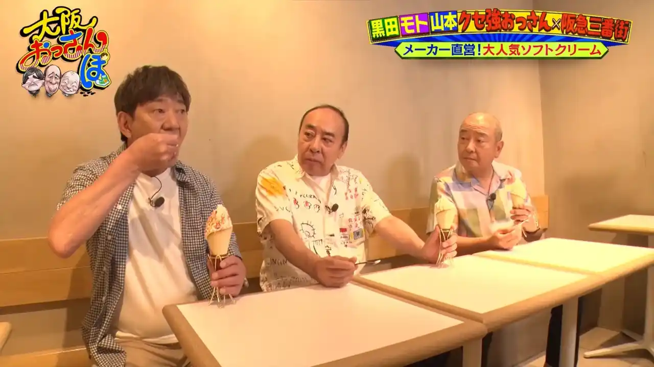 黒田が「これ、めちゃくちゃウマいですよ」とテンションが上がったのは「シルクレーム 阪急三番街店」のソフトクリーム。モトも「俺、ソフトクリームにはうるさいのよ」ということで味わうことに。 |