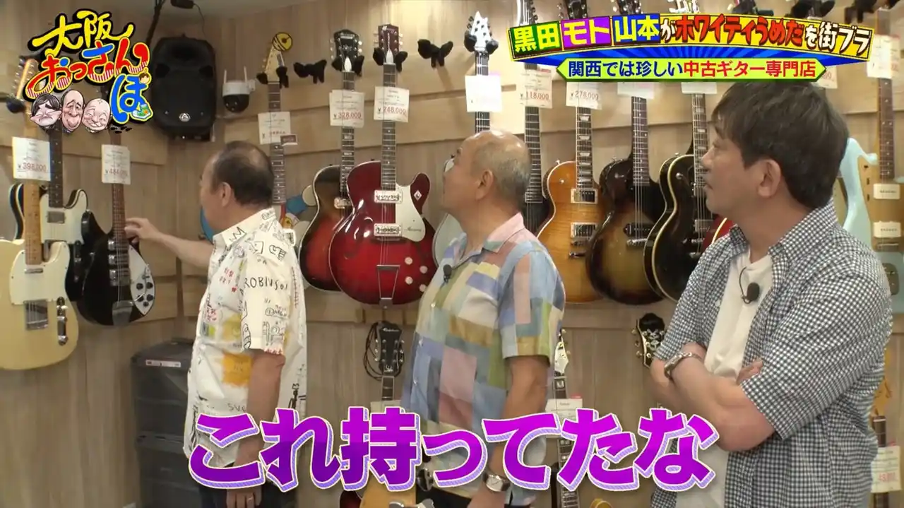 買い物を済ませたおっさんたちが次に向かったのは、ホワイティ梅田。もともとバンド活動をしていたモトなら「喜んでくれるかも」(黒田)と、中古楽器専門店「中古楽器専門店Qsic」を訪れる。 |