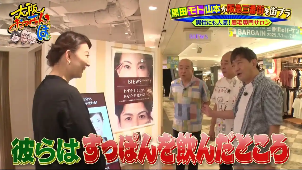 意外にも美容に気を使っているというモトと山本。そこで3人は南館地下1階にある眉専門サロン「BIEWS EYEBROW STUDIO」へ。美人店員ぞろいで、思わず黒田は「彼らはすっぽんを飲んだところなので、危ないです」と注意喚起!? |