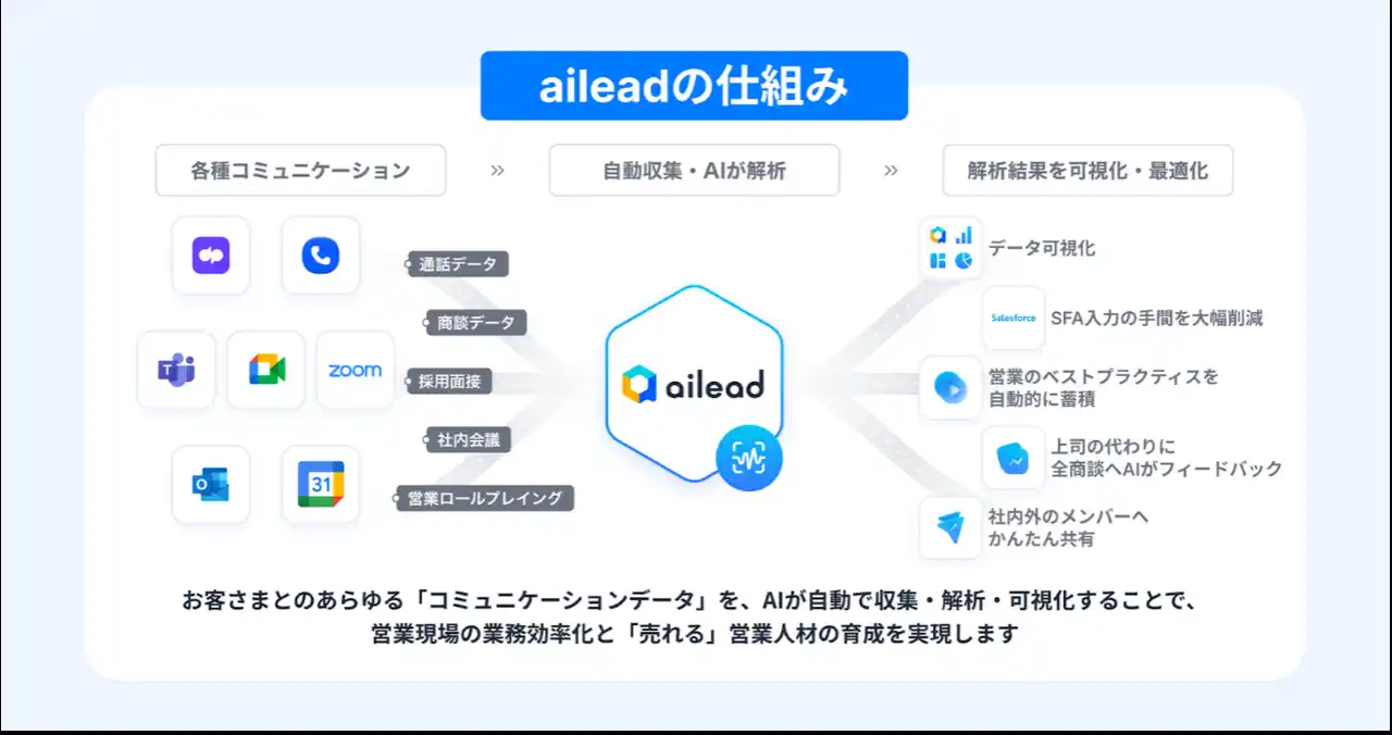 aileadは、営業や面談のコミュニケーションデータをAIが自動解析し、成果に直結する要素を「可視化」するとともに、改善ポイントを特定して活動を「最適化」するサービスです。これにより、属人化しがちな営業活動を標準化・高度化し、担当者のスキル向上やマネージャーによる効果的な育成を支援。人材育成と生産性向上を同時に実現してきました。 |
