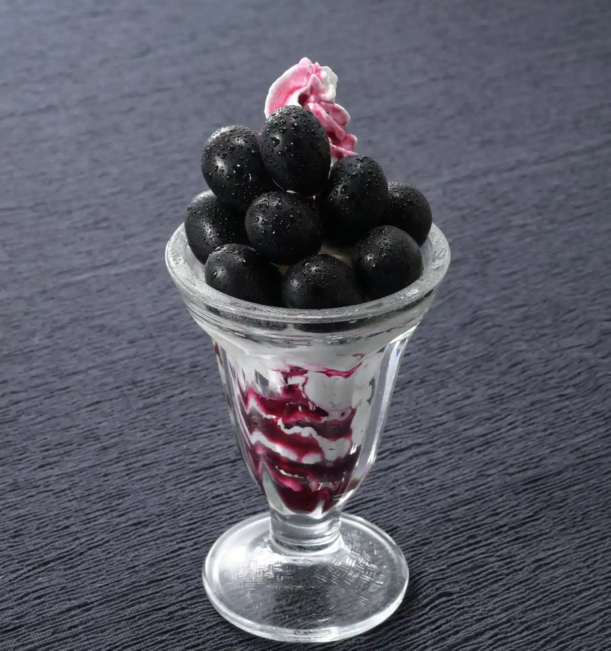 その希少なナガノパープルを贅沢に9粒使用した、特別なパフェが登場しました。種がなく皮ごと食べられるナガノパープルは、みずみずしく上品な甘みと芳醇な香りが特長で、その魅力を最大限に引き出すため、バニラアイスやなめらかな杏仁豆腐と組み合わせ、一粒一粒が黒い宝石のように輝くぶどうと、素材それぞれが織りなす繊細な味わいを心ゆくまでご堪能ください。 |