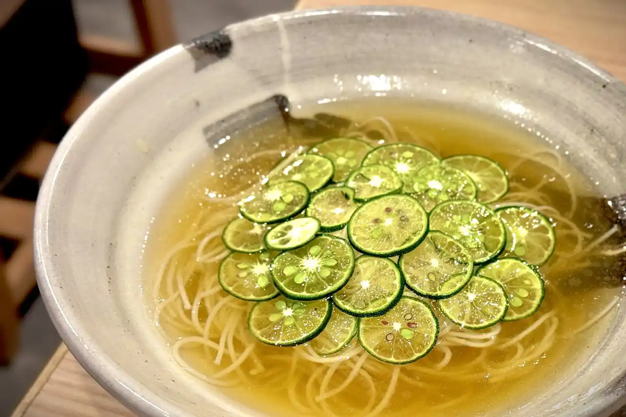 『シークヮーサーそうめん』は、店内仕込みの鶏ガラスープを使用した、黄金色の出汁にシークヮーサーを浮かべた、見た目にも涼やかなそうめん。最後の一口までさっぱりといただける一杯で、ジンモヒートやハニーレモネード風カクテルとの組み合わせがおすすめです。 |
